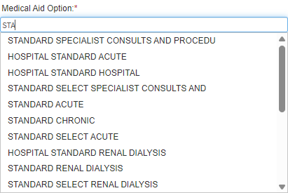 - Click on the Medical Aid Option field and start typing the name of the desired Medical Aid option. 1 character is required before the list becomes available.