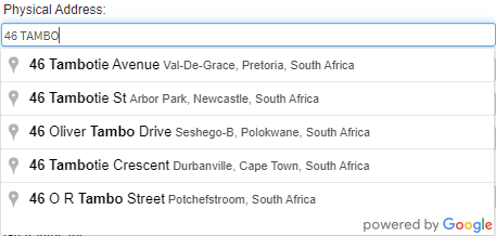 ?Please Note: The Physical Address auto-fill feature is integrated with Google Maps and will automatically populate the Address fields when a selection is made from the suggestion list. Using this feature is optional, and you are also able to manually enter the address.
