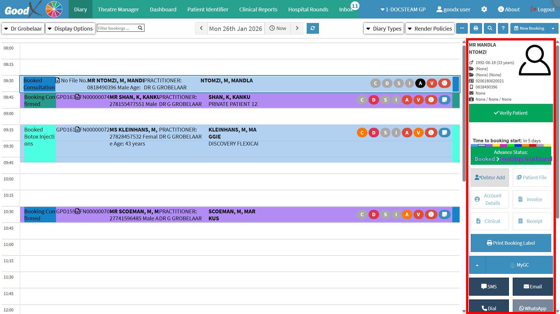 - Click on the Booking of the new Patient to access the Diary sidebar.