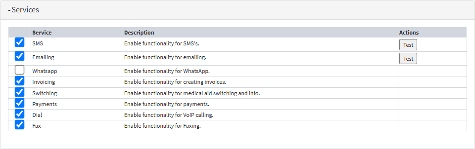 You can configure and test features such as SMS and email communication, and enable key functionalities including Invoicing, claims, payments, and communication preferences like VoIP or fax.