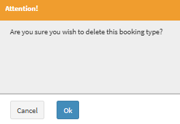 - When deleting a booking setup, the following Attention screen will pop up asking if you are sure that you want to delete the Booking Type.