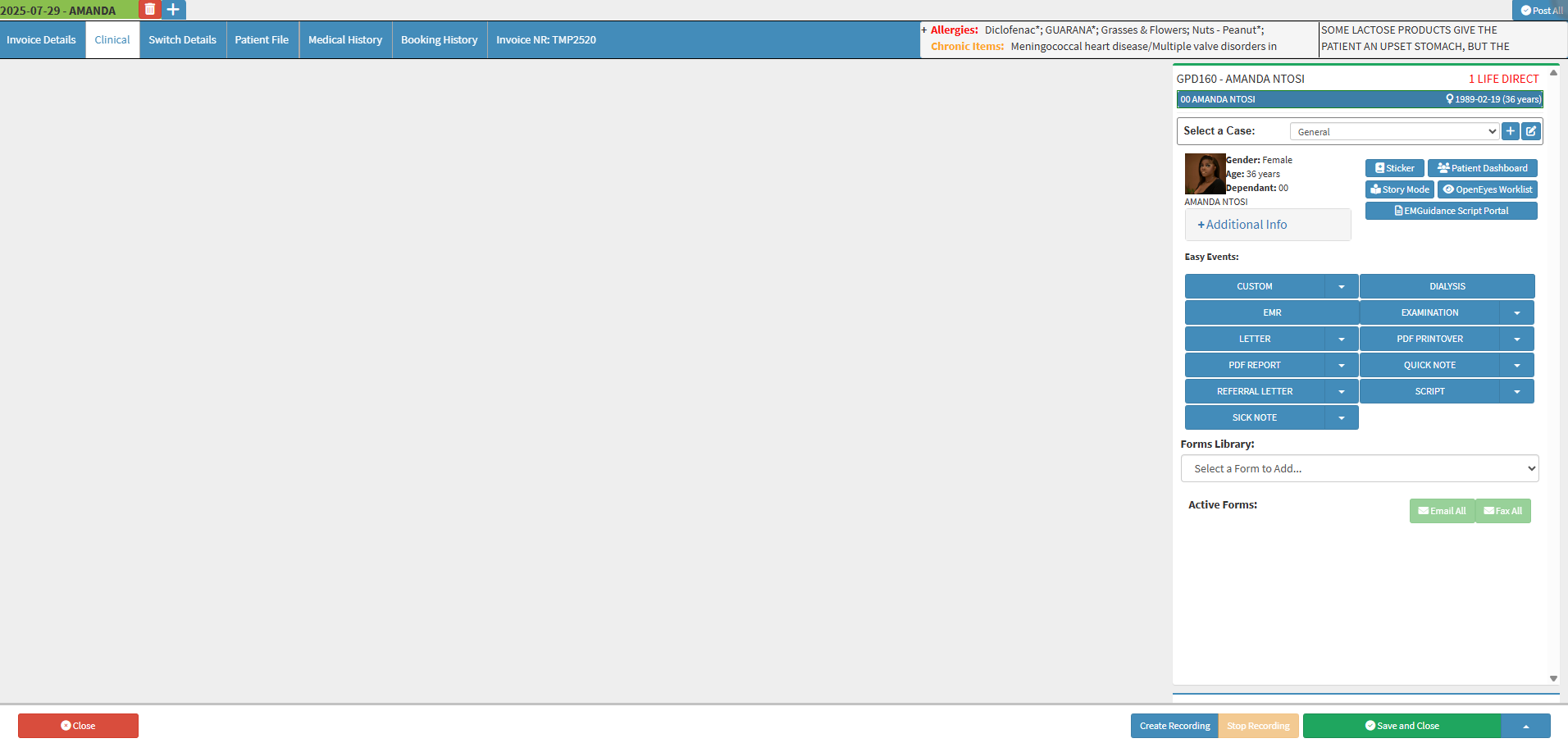 - Click on the Save and Close button to save any changes and exit the Clinical screen.