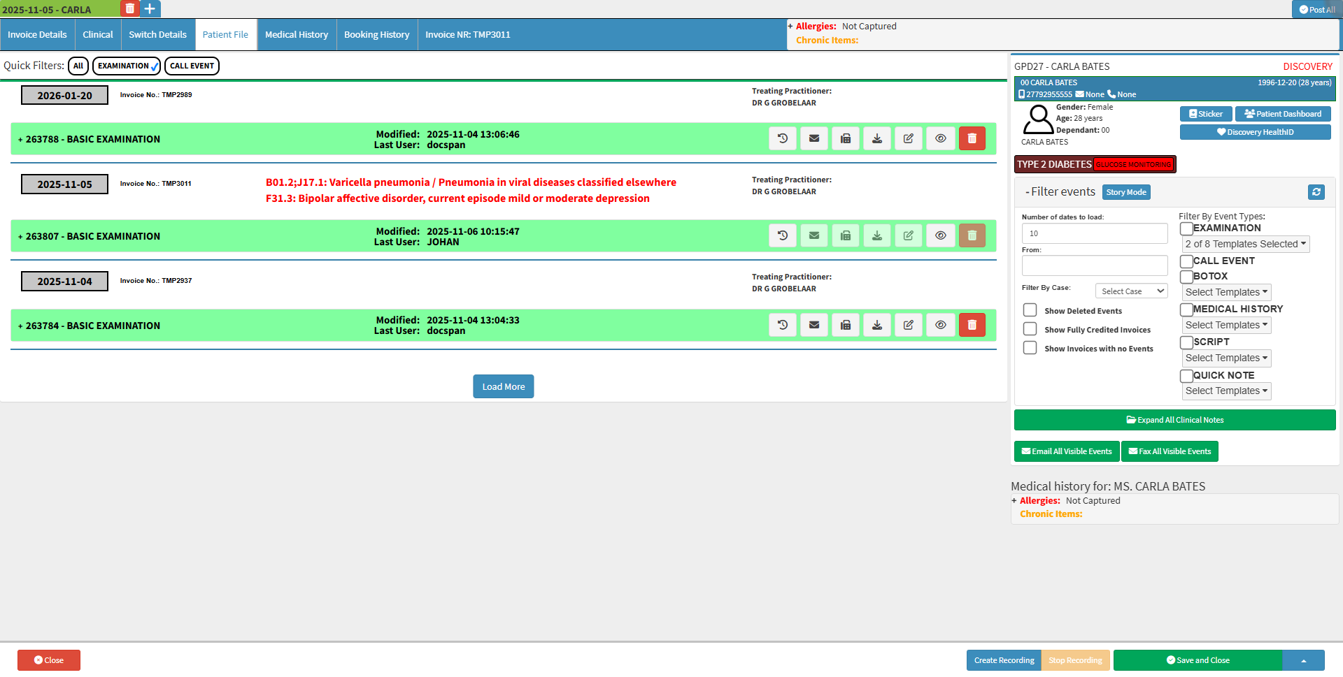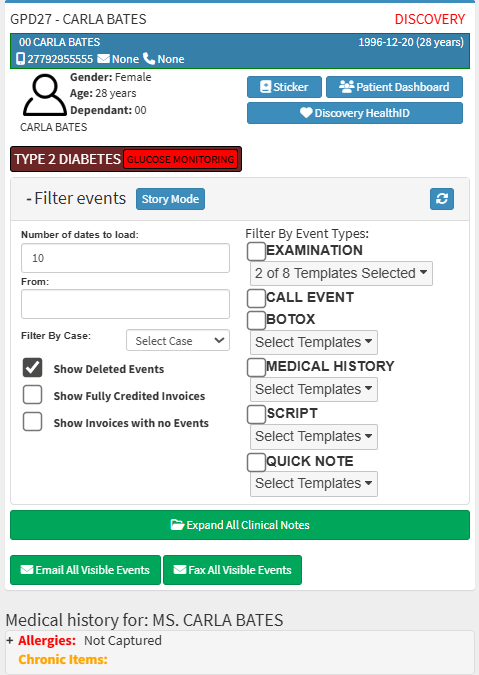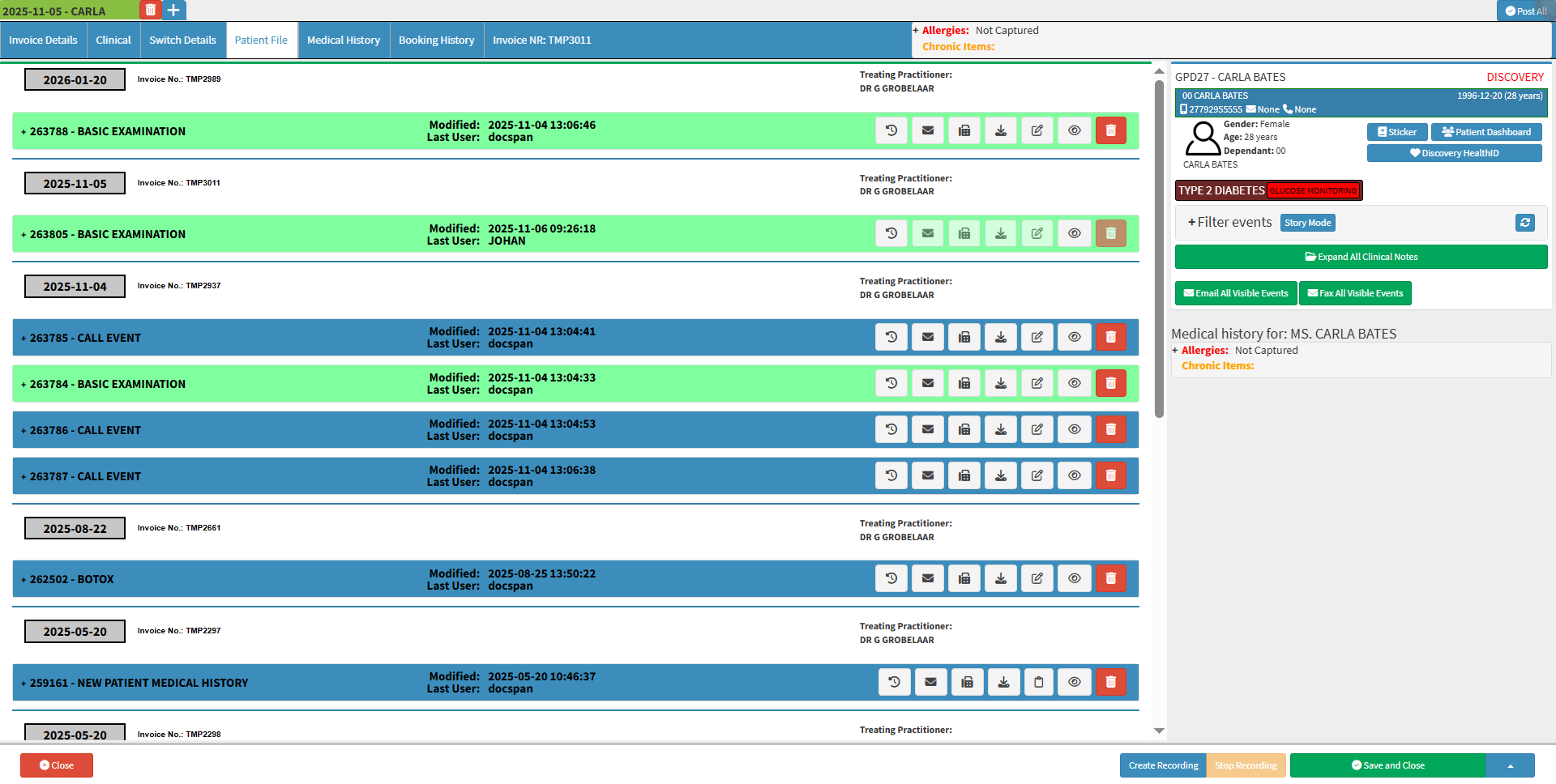 Each Clinical Event that has been captured will have its own Entry on the Patient File screen.