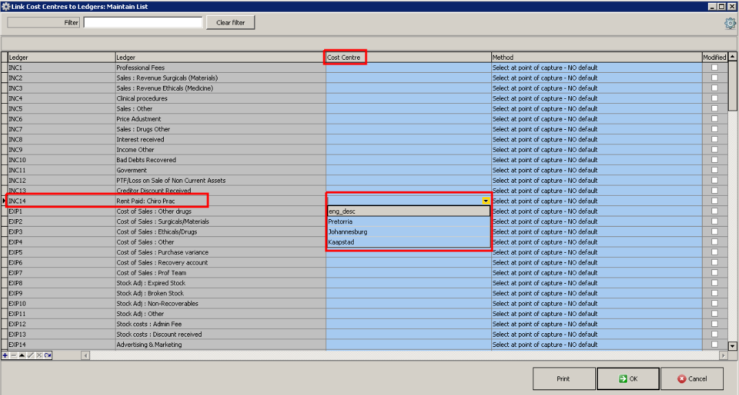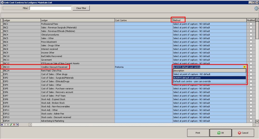- To select a default cost centre, in the applicable ledger line, click in the Cost Centre column on the drop down, and select the required cost centre