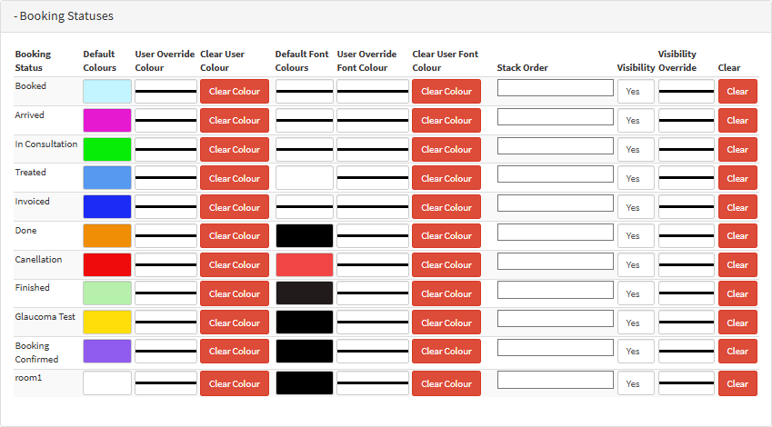 - Clear: Completely clears all user-set overrides colour, font, stack order, and visibility for that particular Booking Status, reverting it to the system default.