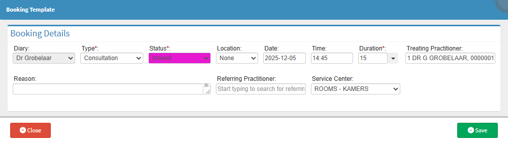 Location: The exact room where the booking will take place within the Practice.