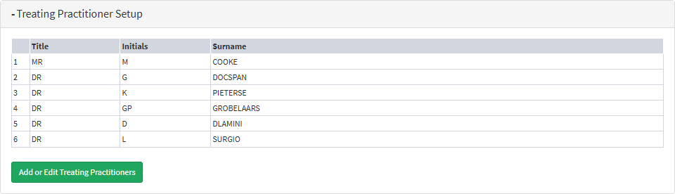 - When the Treating Practitioner has been created, their details will display under the Treating Practitioner Setup Panel.
