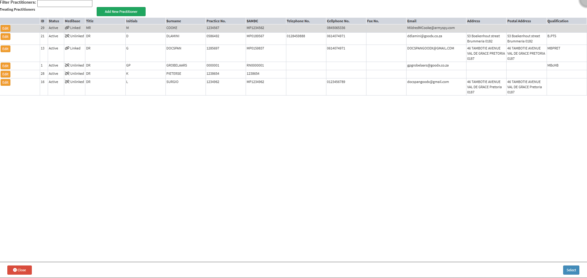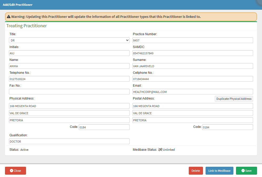 💡Please Note: Not all the fields have to be completed. The Title, Initials, Surname, Practice Nr, SAMDC, Cell Nr and Email are important fields that should be completed. This information should be double-checked to make sure it is 100% correct, as the claims will be sent through to the Medical Aid with this information of the Practitioner. If the details eg, the Practice number, are incorrect, the claims will not be paid out to the Practice.