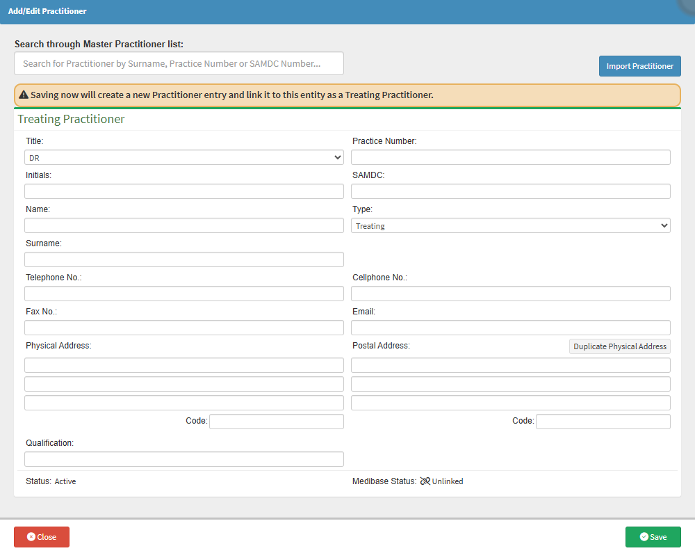 💡Please Note: A Treating Practitioner can also be added from the Practitioner List tab. For more information, please refer to the user manual: How to Add a New Practitioner.