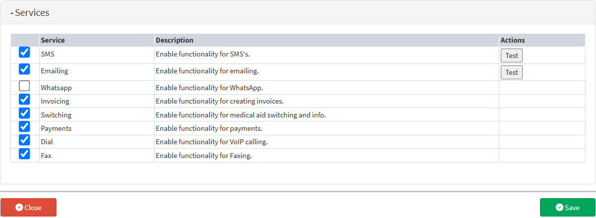 Under the Actions column, test buttons allow you to check whether the SMS and Email services are functioning correctly after activation.