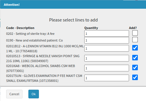 - Click on Cancel to close the pop-up, no items will be added to the invoice.