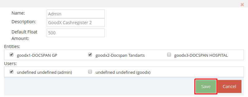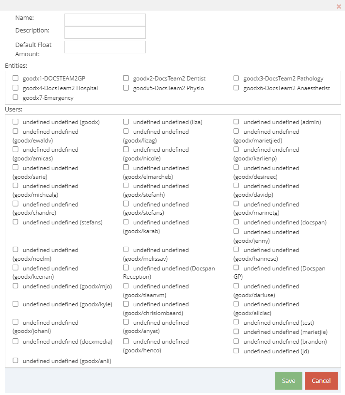- Default Float Amount: Every day the Practice's Cash Register will start with a float, and therefore the float needs to be standardised. for example R2000 each day.