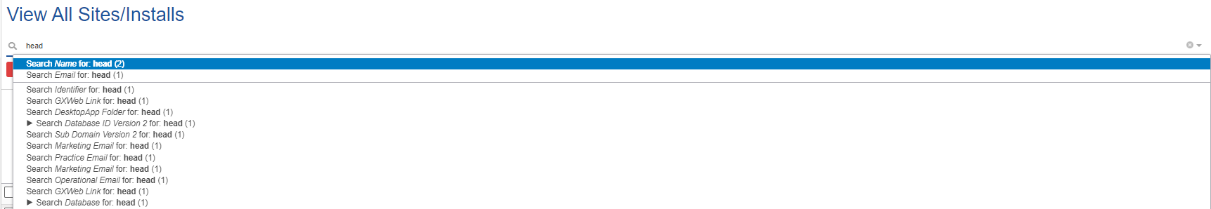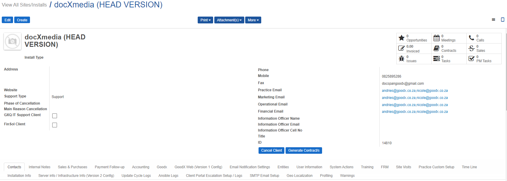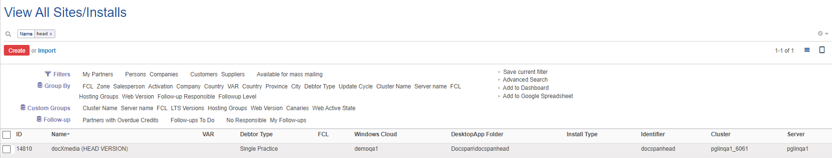 - The View All Sites/Installs / docXmedia (HEAD VERSION) screen will open, showing all your Practice's install details.