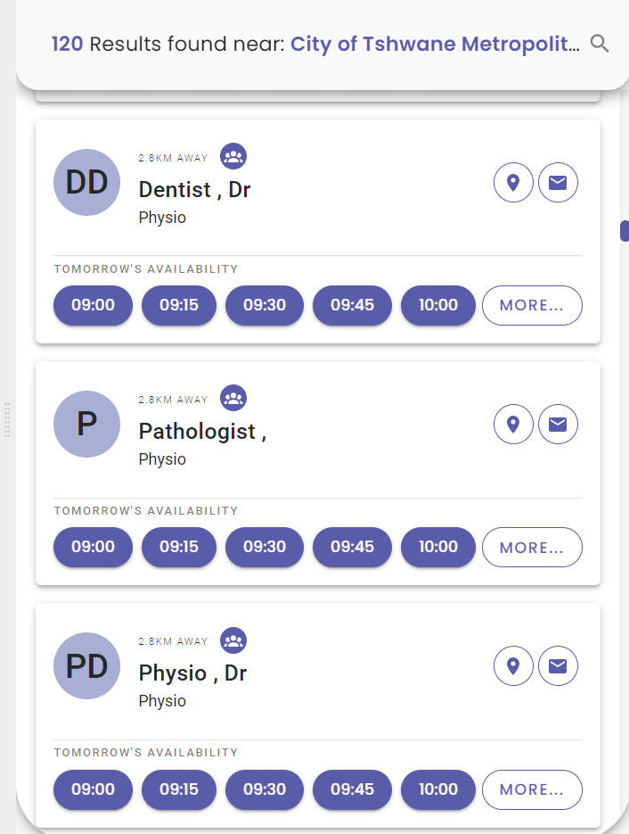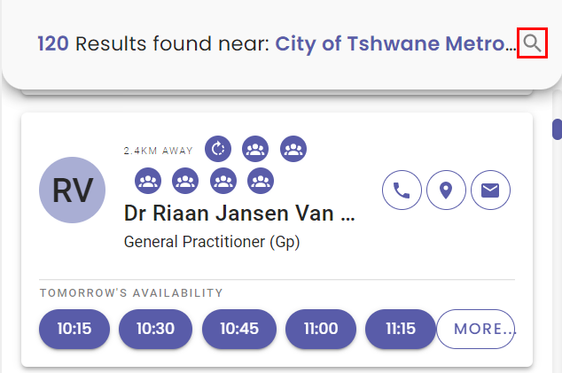 - A list of the Practitioners from the search results will also be available on the sidebar, in the order of nearest proximity to the location entered.