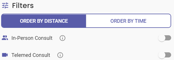 - Order by Time: Lists the search results by the first available timeslot. Only Practitioners that are registered on the myGC app will be discoverable through the Order by Time filter.