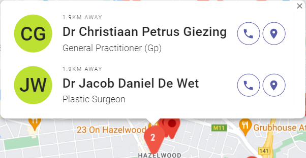 - Red Location Pin: An indication of relevant Practitioners that have been found during the search.