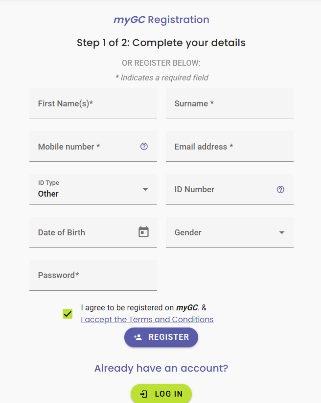 - For more information on the myGC Registration screen, please refer to user manual: How to Create a New Account Whilst Making a Booking