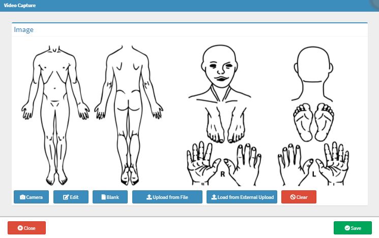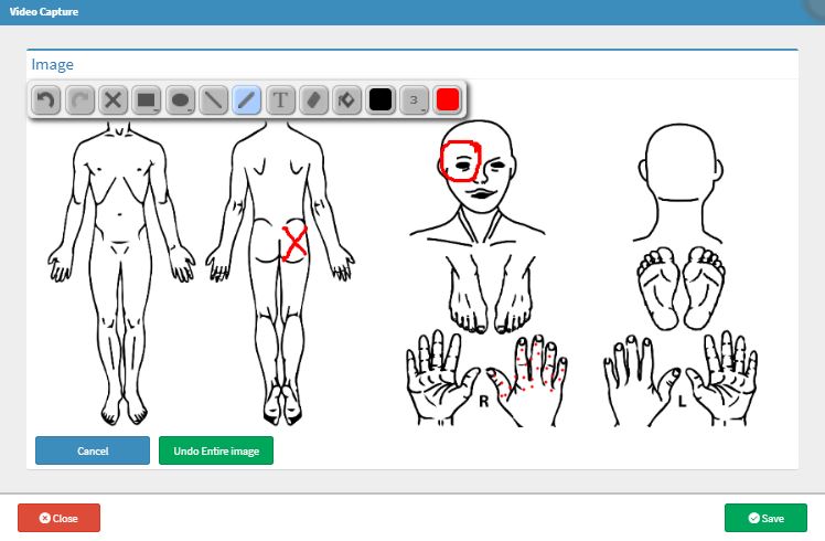 - The Examination Sketch will now be Editable. The Doctor can use the different drawing options under the Image header to draw or make Notes on the Sketch that apply to the Patient injury or illness.