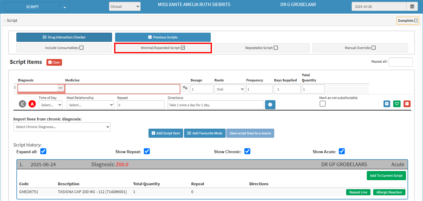 - Expanded: When enabled, this option automatically expands all lines on the Script. This setting is useful for a Practitioner who prescribes multiple medications at once. However, it is optional and can be enabled based on the Practitioner’s preference.