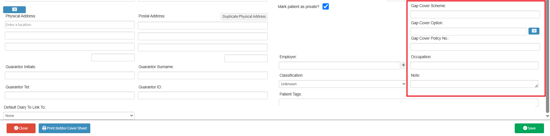 - Gap Cover Scheme: The name of the company with whom the Patient has short-term insurance.