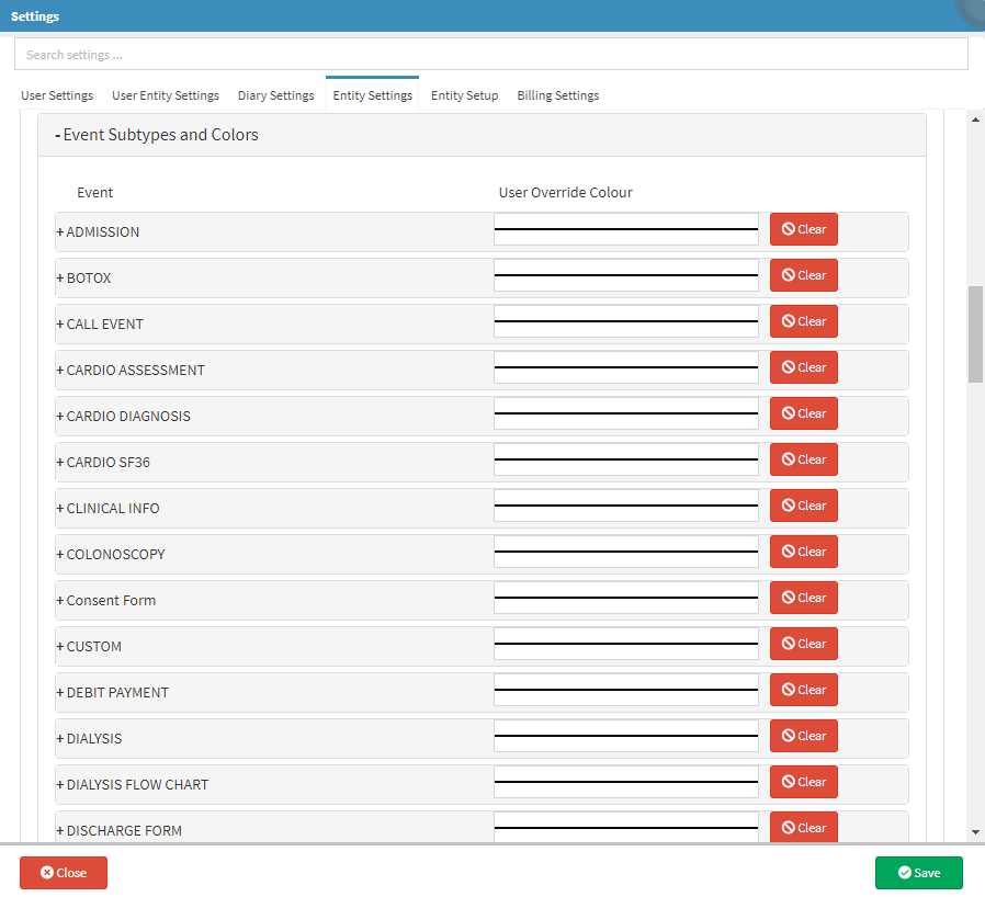 Event Subtypes are smaller categories that Clinical Workflow Events can be divided into, by the means of using colours as a visual indicator by which Clinical History Event types can be identified. Users are also able to set up separate colours for Workflow Events Templates that have been configured, that differ from the default Workflow Event. Using colours in the Clinical History allows the Practitioner to easily identify and navigate to the desired event on the Clinical History screen.