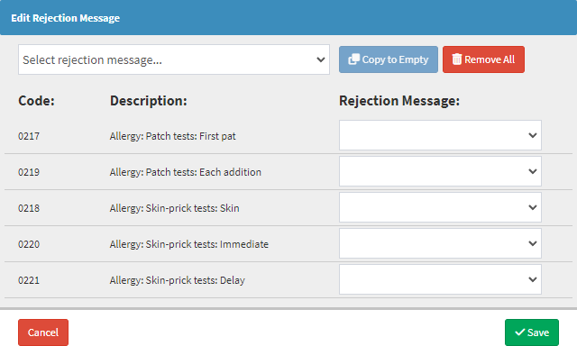 Click on the Remove All button to remove the Medical Aid Rejection Codes from the Rejection Message fields.