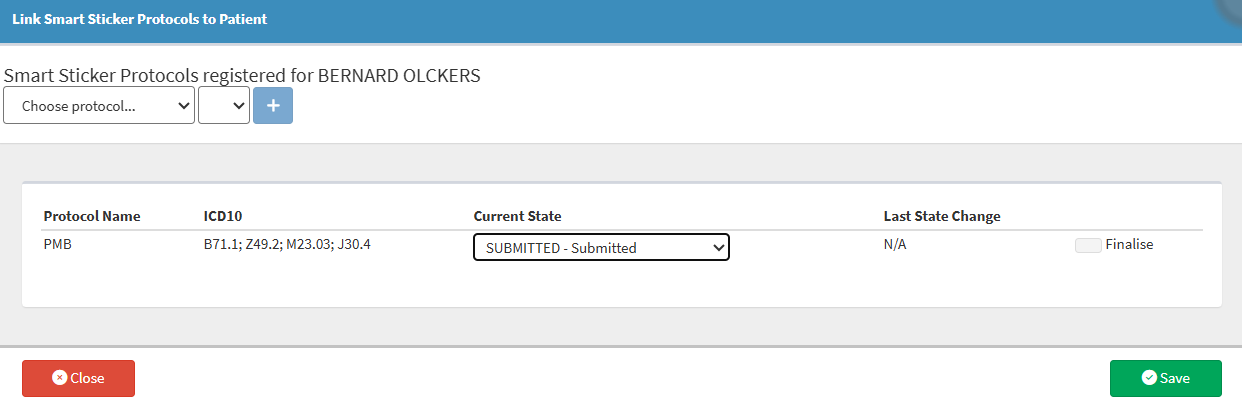 An Attention! pop-up will appear advising the user that the Patient can be registered for the Smart Sticker Protocol linked to the ICD10 code typed in the Diagnosis field.
