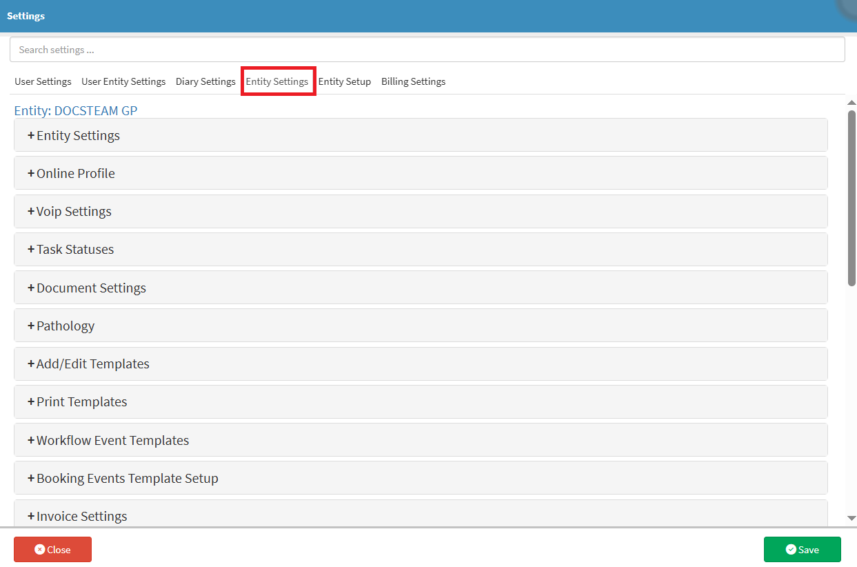 - Click on the Entity Settings tab