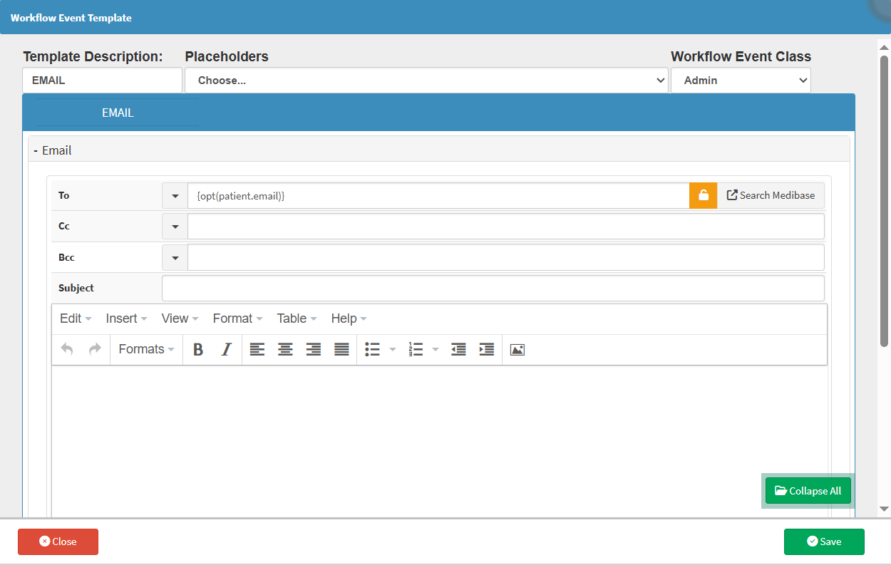 - To: A placeholder will be used here for the Patient’s email address. The system will automatically insert the Patient’s email when sending an email using the template.