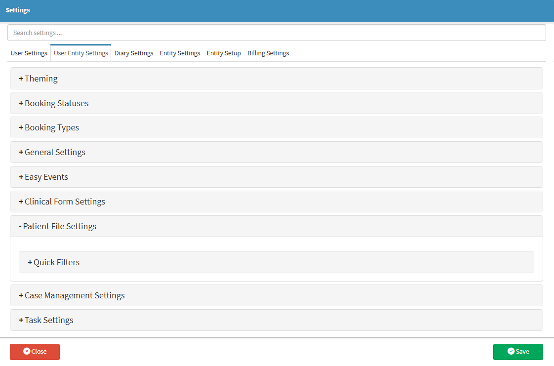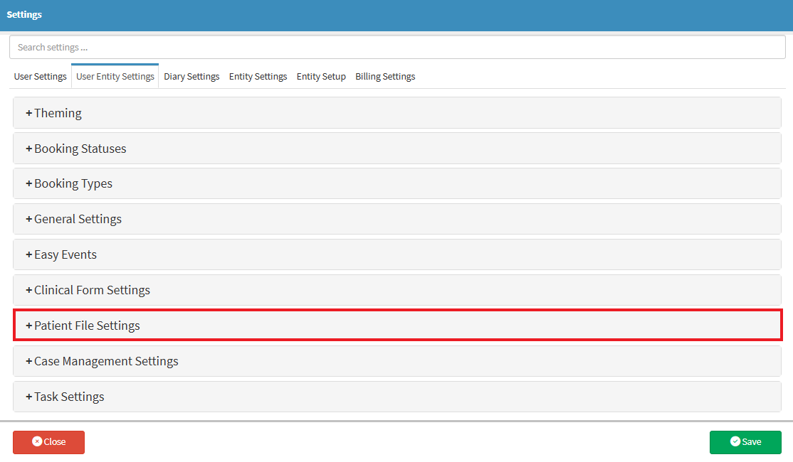 User Entity Settings: Patient File Settings