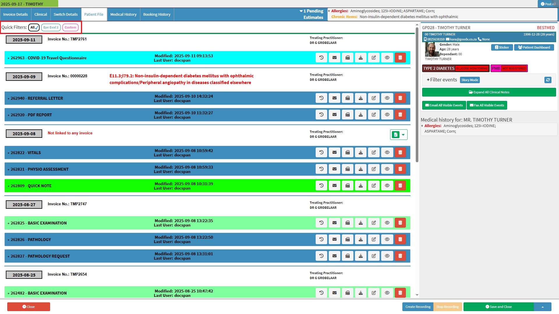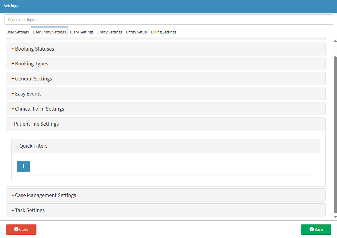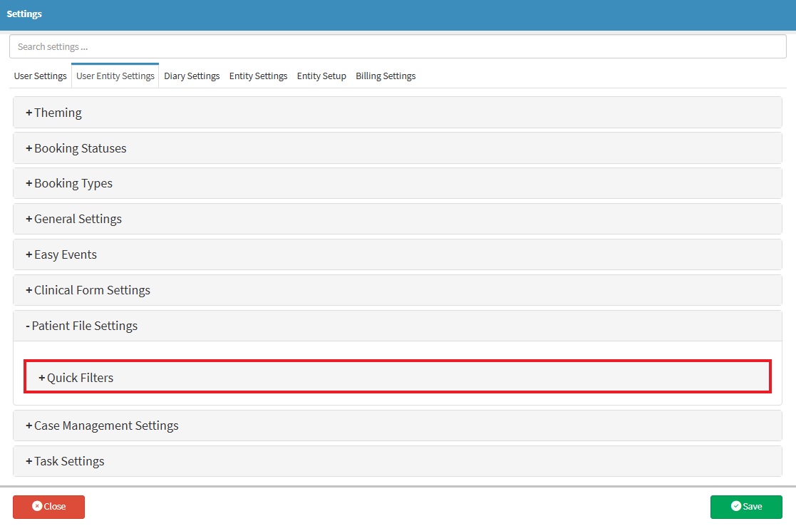 Patient File Settings allow you to manage how clinical events are displayed and accessed within the system. By setting up Quick Filters, the Practice can easily narrow down and organise Patient clinical records based on specific criteria.