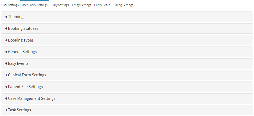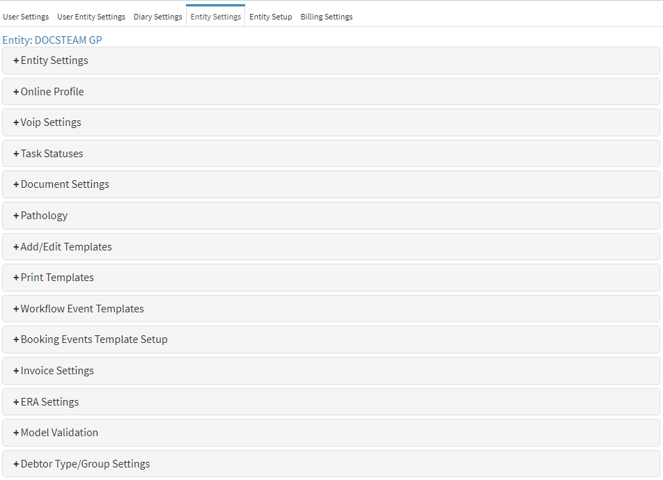 Entity Settings allow you to configure various preferences on an Entity level, including Online Profiles, VoIP, Task, and Document settings. You are able to also set up different Templates, Forms, and Settings associated with Patient Files and Case Management.