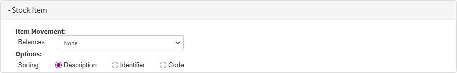 The Stock Items Panel helps you organise and view stock efficiently by selecting balances and sorting options for easier management.- Click on the Balances drop-down menu to select the relevant option.