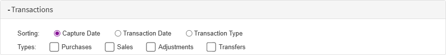 Indicating what type of Transactions will be included in the report.- Tick the relevant Sorting option.