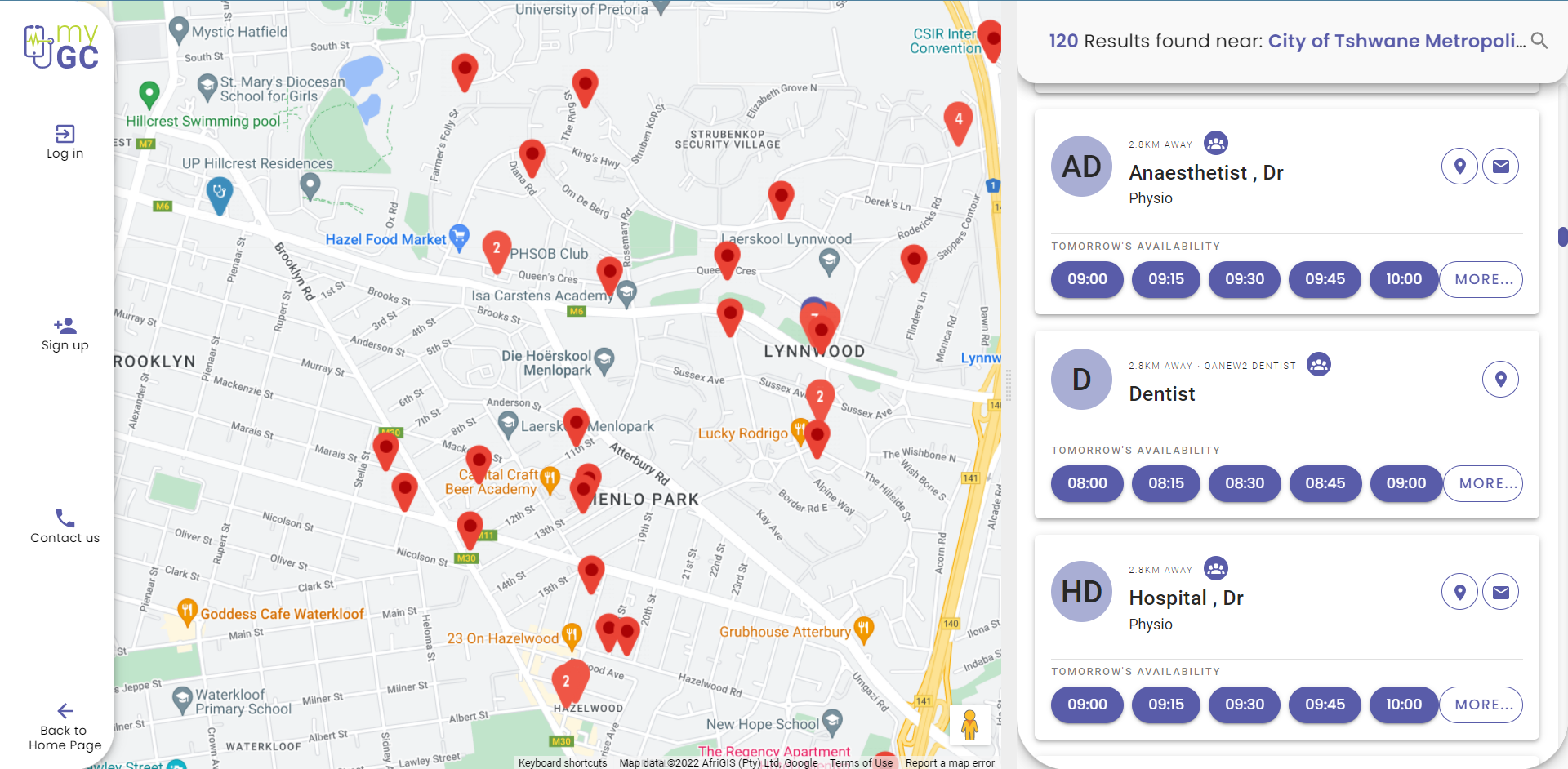 Without being logged in to the myGC App, the user can access the Practitioner search function and also view the Practitioner's availability for online bookings. Once the user finds a relevant Practitioner, and a suitable timeslot, the user will be allowed to make a booking.