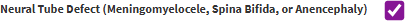 Tick the Neural Tube Defect checkbox if there's a known history of conditions like Meningomyelocele, Spina Bifida, or Anencephaly.
