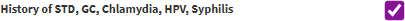 Tick the History of STD, GC, Chlamydia, HPV, Syphilis checkbox if there is a known history of any sexually transmitted infections.
