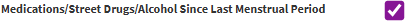 Tick the Medications / Street Drugs / Alcohol Since Last Menstrual Period checkbox if the Patient has taken any of these substances.