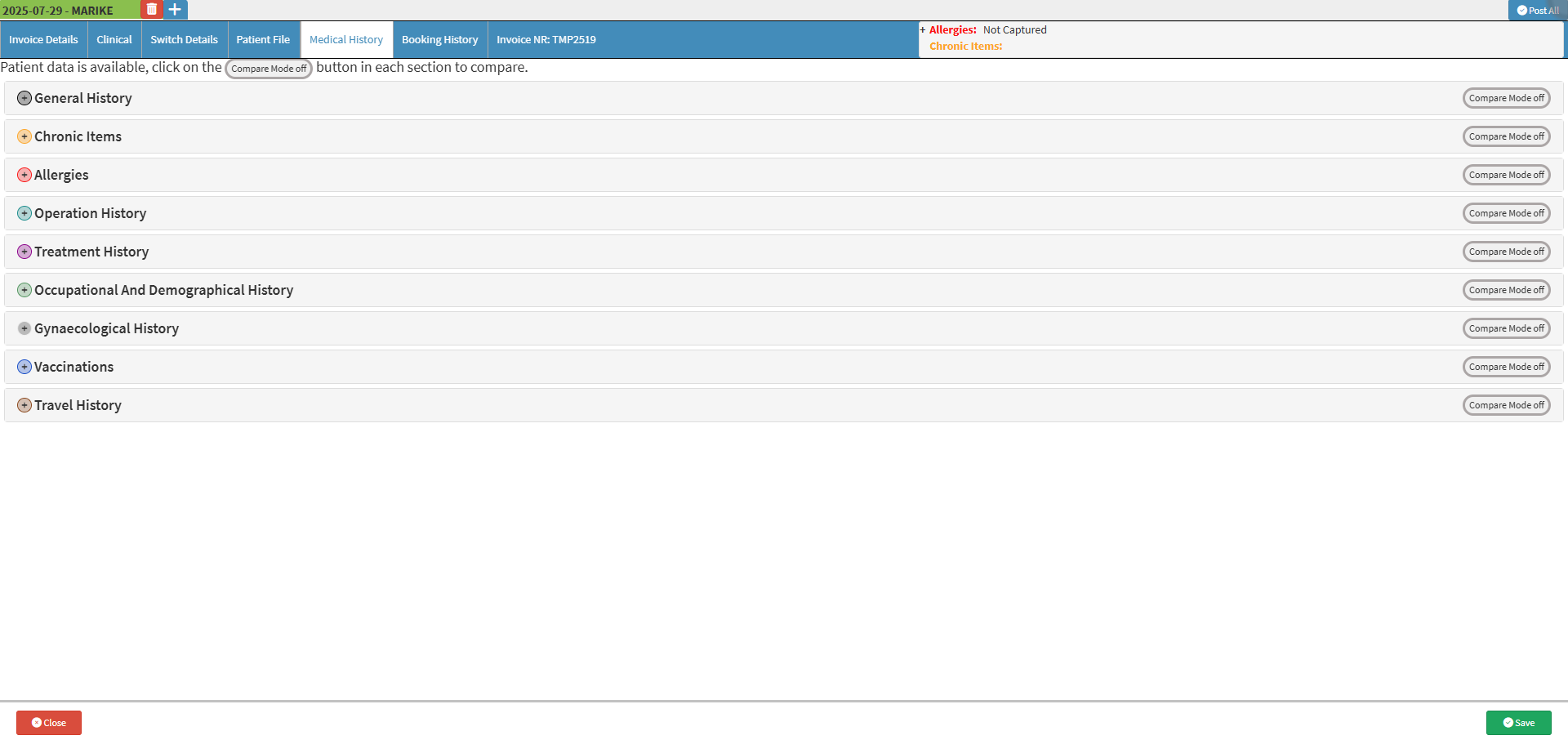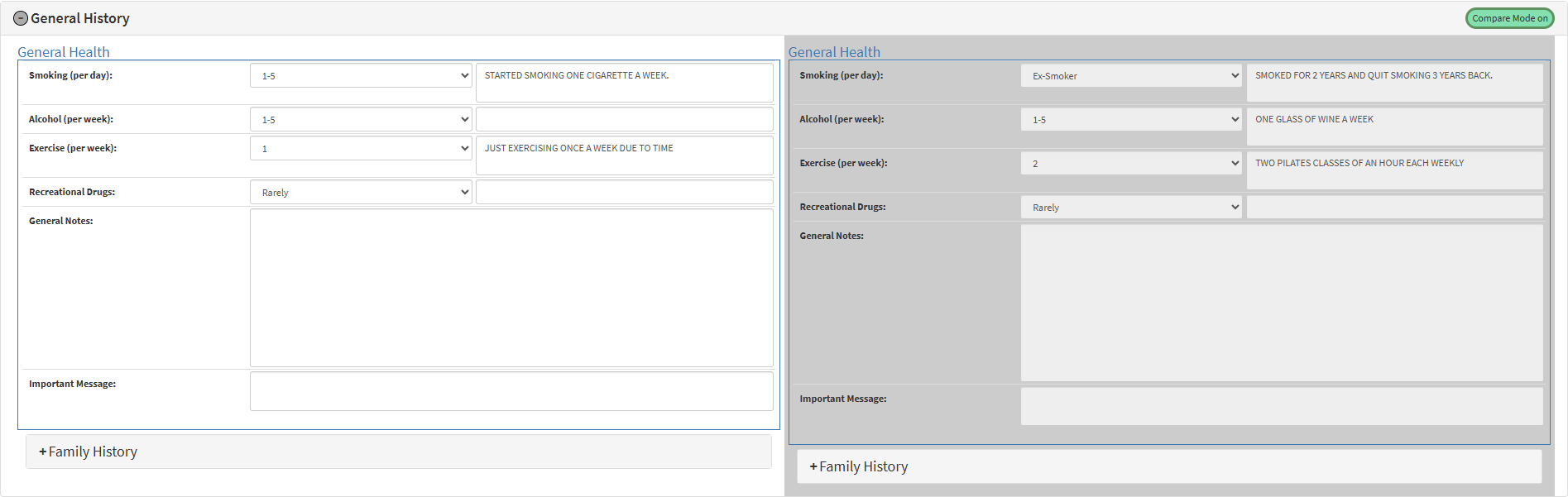 The Compare Medical History feature improves how updated medical data is handled when received through myGC. Once a Patient or Dependent with myGC submits their medical history, the information is displayed as a view-only document in the system’s notebook. The Practitioner can use the Compare function to evaluate this submitted information alongside existing data in the system. Fields completed via myGC are shown in grey and cannot be edited, allowing the Practitioner to manually decide what to keep and update in the official Medical History. This feature is only available when the Practice has myGC enabled and the Patient or Debtor is linked to a valid myGC profile.