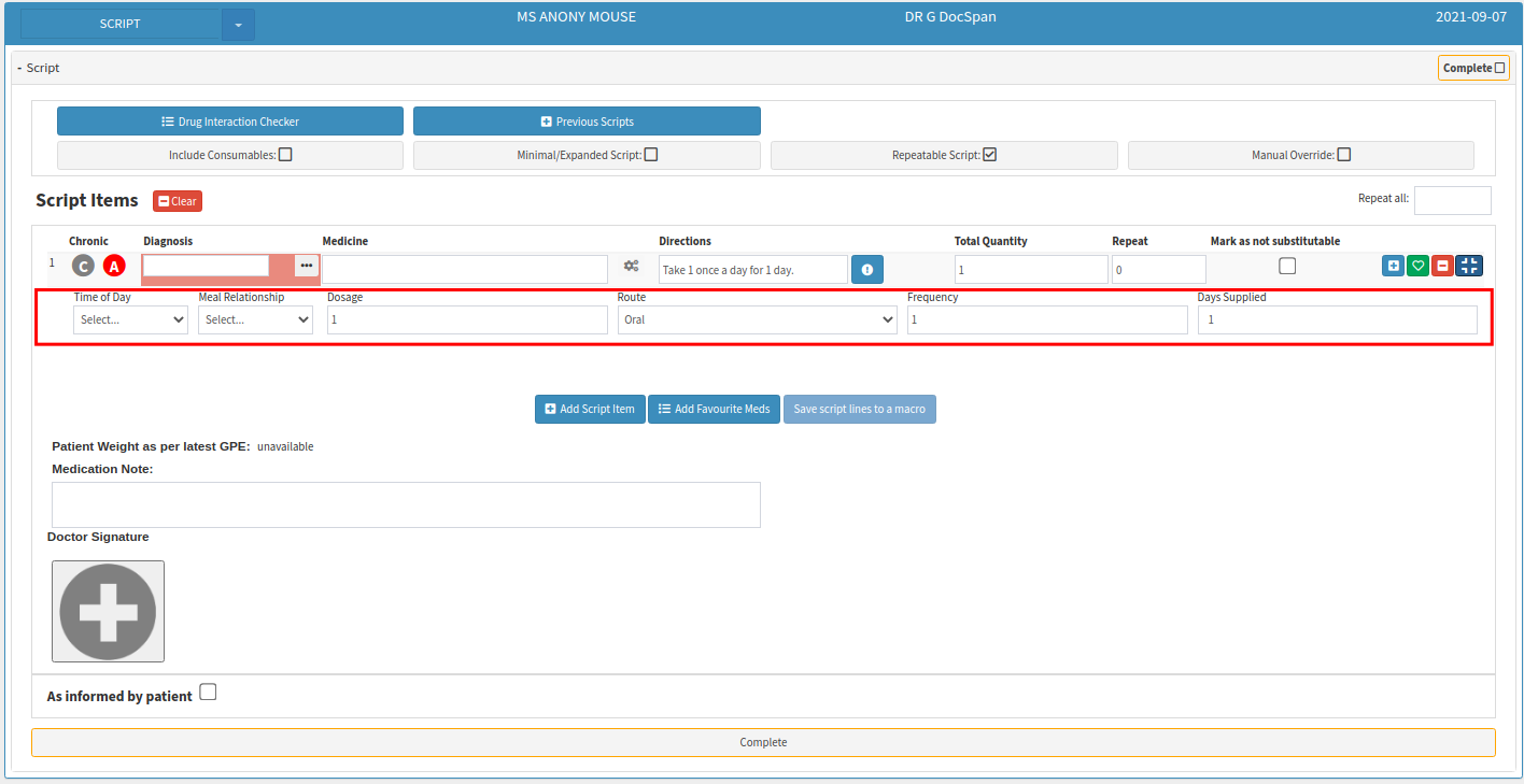 Clickon theExpand button to expand the directions builder. This allows the practitioner to add very specific instructions on how to take the medication, these instructions will pull through into the directions field.