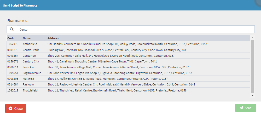 - Click on the Search field to type the name of the desired branch, where the Patient would like the Script to be sent.