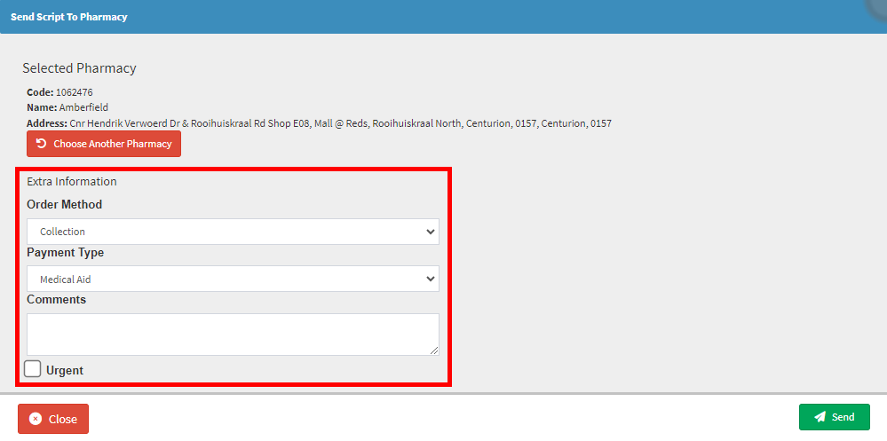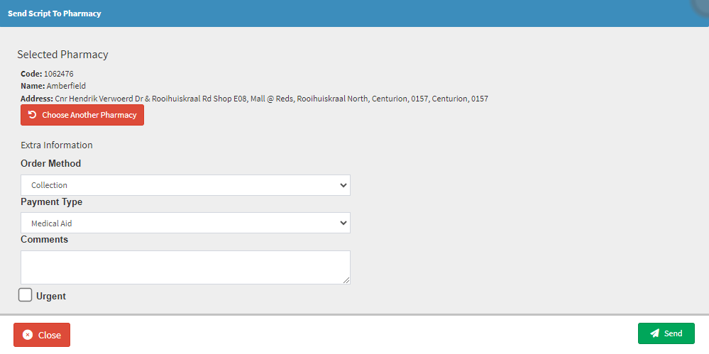 - Click on the Send button to send the Script order to the selected Pharmacy to process the request.