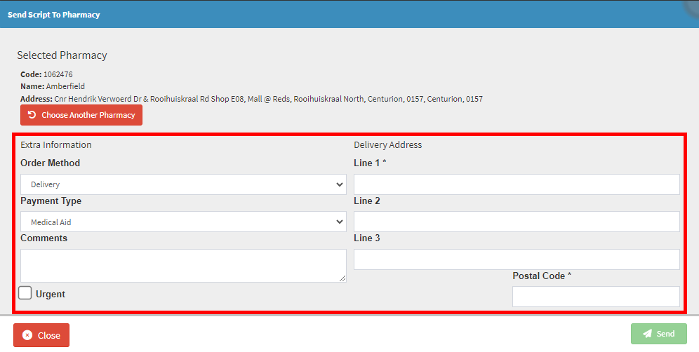 - Tick the Urgent checkbox to advise the Pharmacy that this order must be delivered to the delivery address as soon as possible.