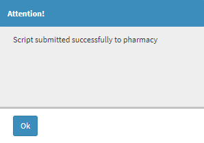 - An Attention! pop-up will appear to advise the Practitioner that the Script was submitted successfully.