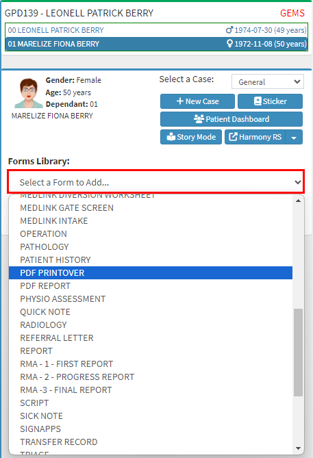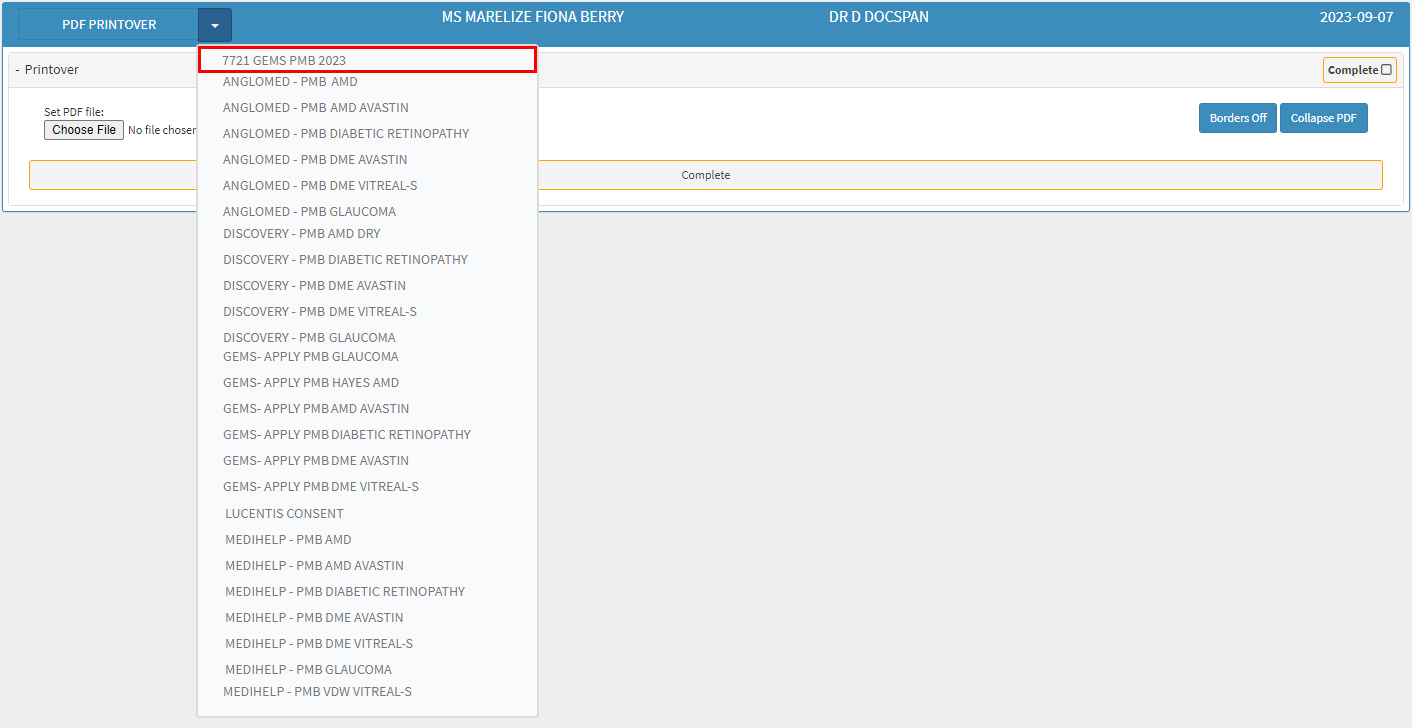 Click on the PDF Printover Workflow Event drop-down menu to select and open the Workflow Event Template that was created specifically for the PMB Registration of the Medical Aid that the Patient is covered by.