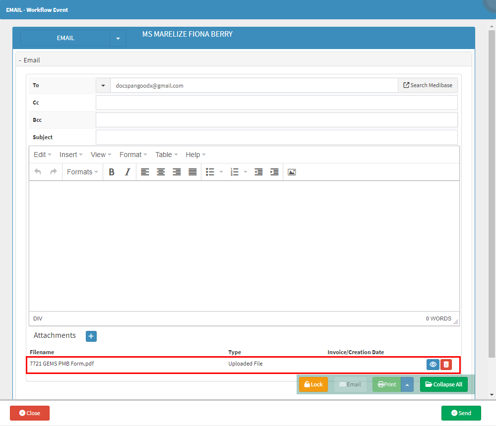 The Email - Workflow Event screen will open with the form attached.