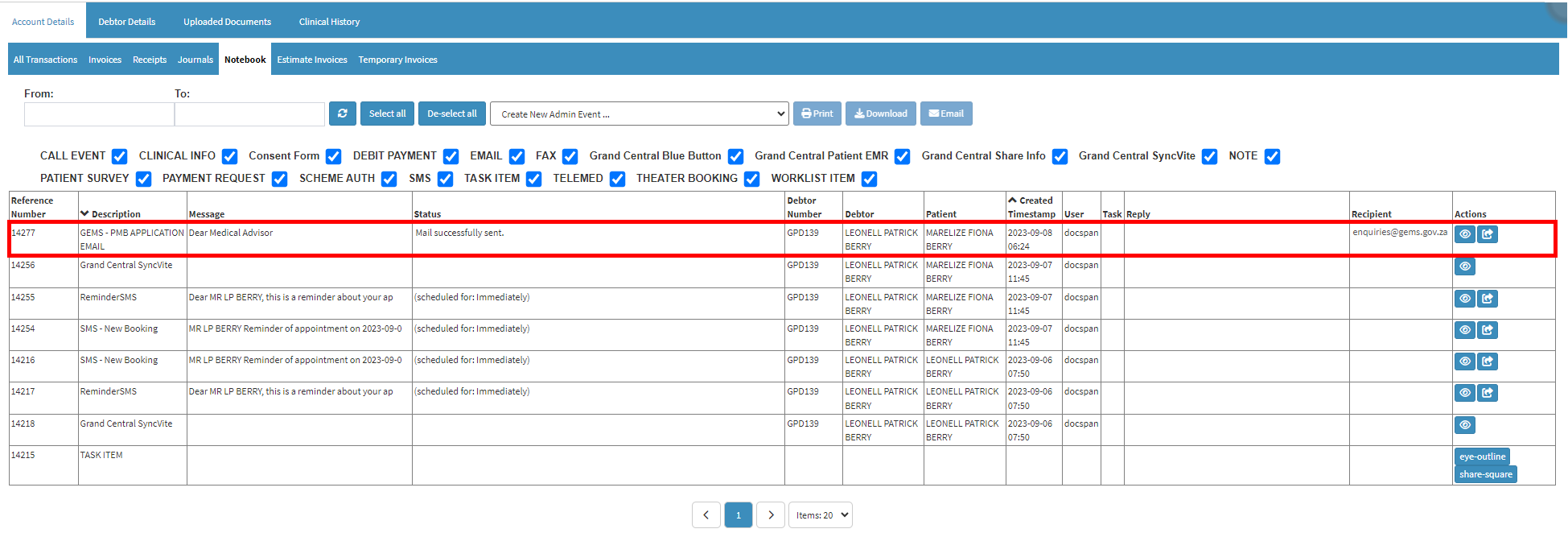 Once the Email has been sent an entry will be added to the Notebook of the Debtor file.
