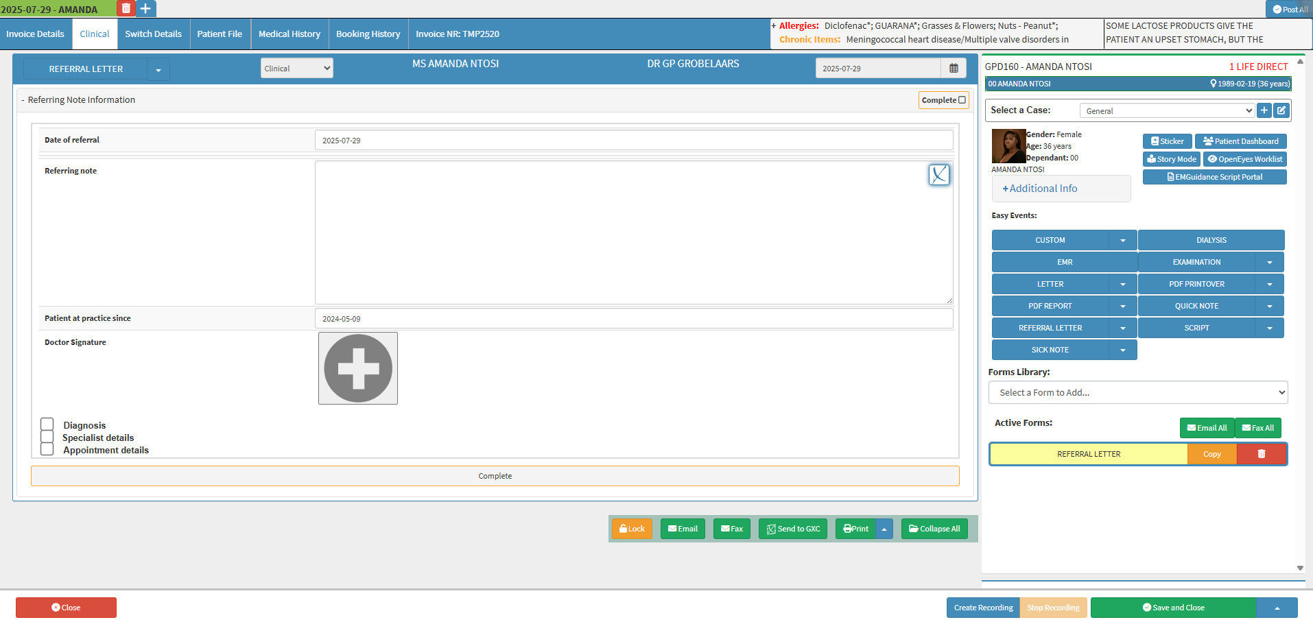 The Referral Letter contains various fields which allow the Practitioner to easily fill in the required information for the referral Practitioner or Specialist.