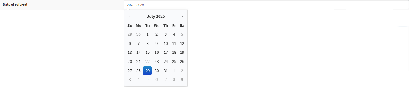 Click on the Date of Referral field to select the date the Patient was referred to another Medical Practitioner or Specialist from the date picker that becomes available.