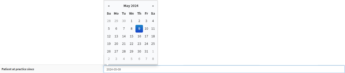 Click on the Patient at Practice Since field to select the date the Patient began receiving care from the referring Practitioner from the date picker that becomes available.